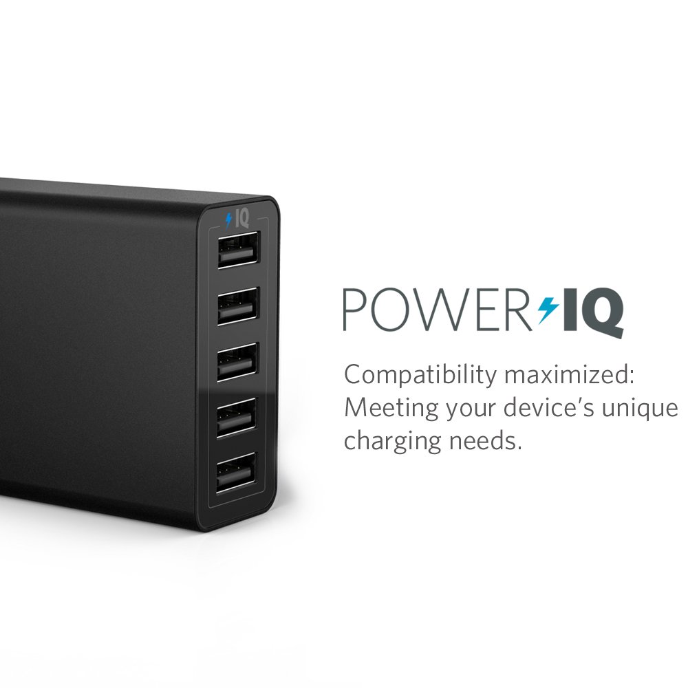 - PowerIQTM technology maximizes compatibility with Android, Apple and other devices by enabling charging speeds of up to 8 amps among 5 ports or 2.4 amps per port.